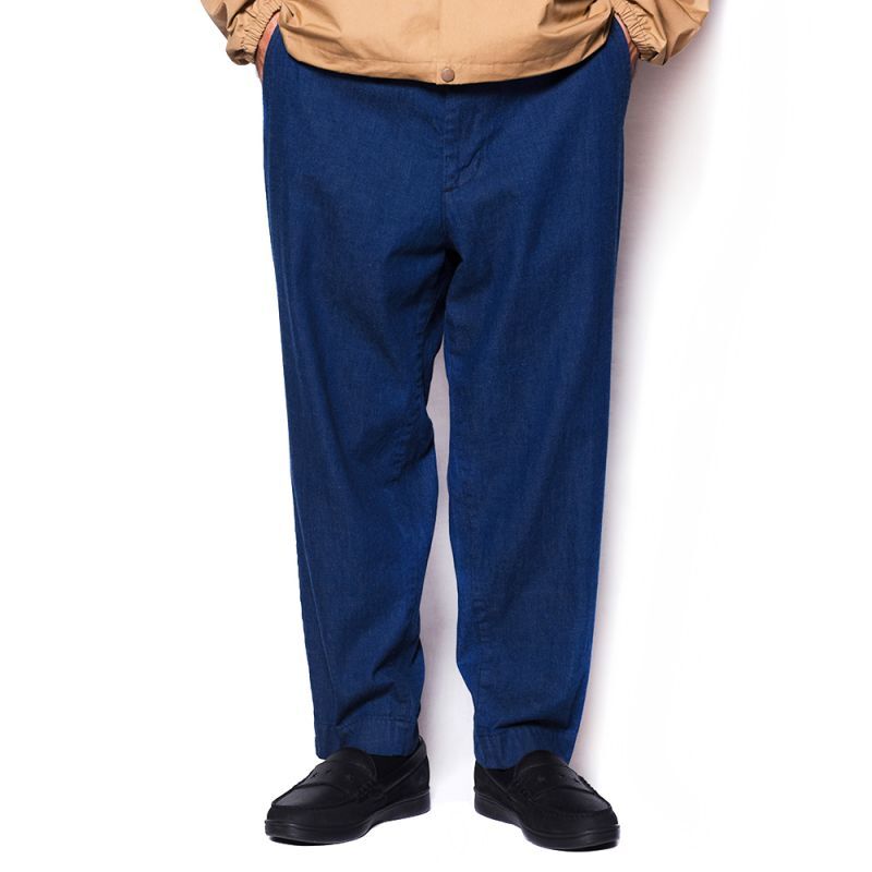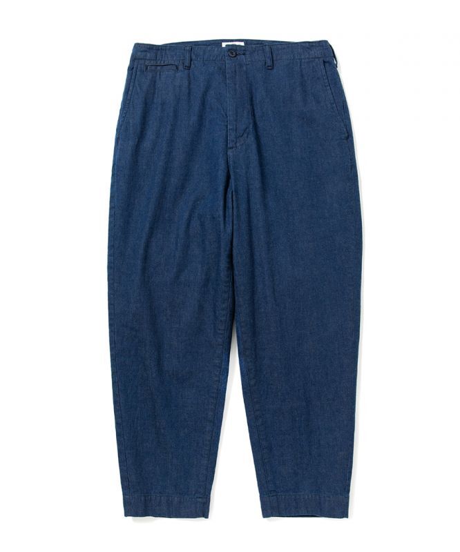 『8.7ozの通称ベタデニムを使用し、作製されたワイドシルエットのテーパードデニムチノパンツ』