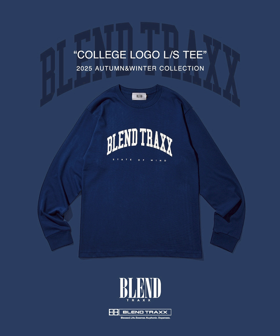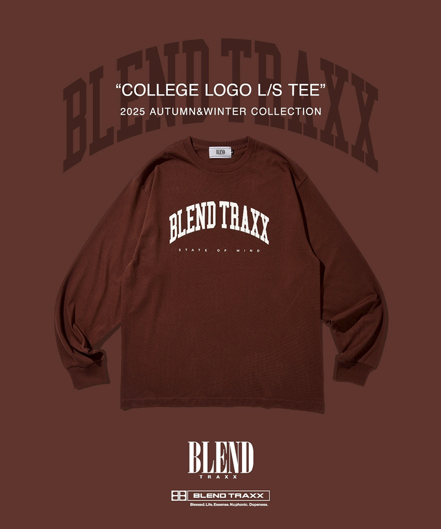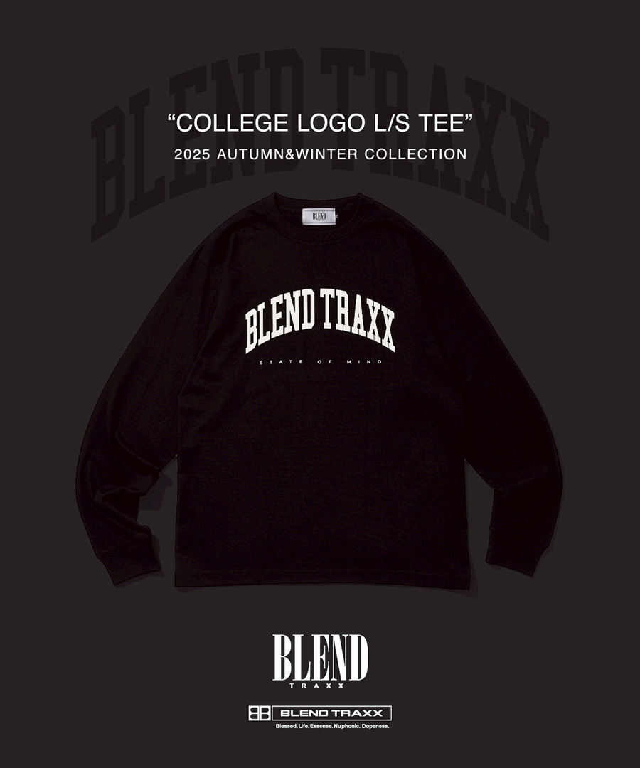 MUSIC&WEARをコンセプトに、架空のダンスミュージックレーベル『BLEND TRAXX』のカレッジロゴが落とし込まれたアメリカンライクなロングスリーブTシャツ