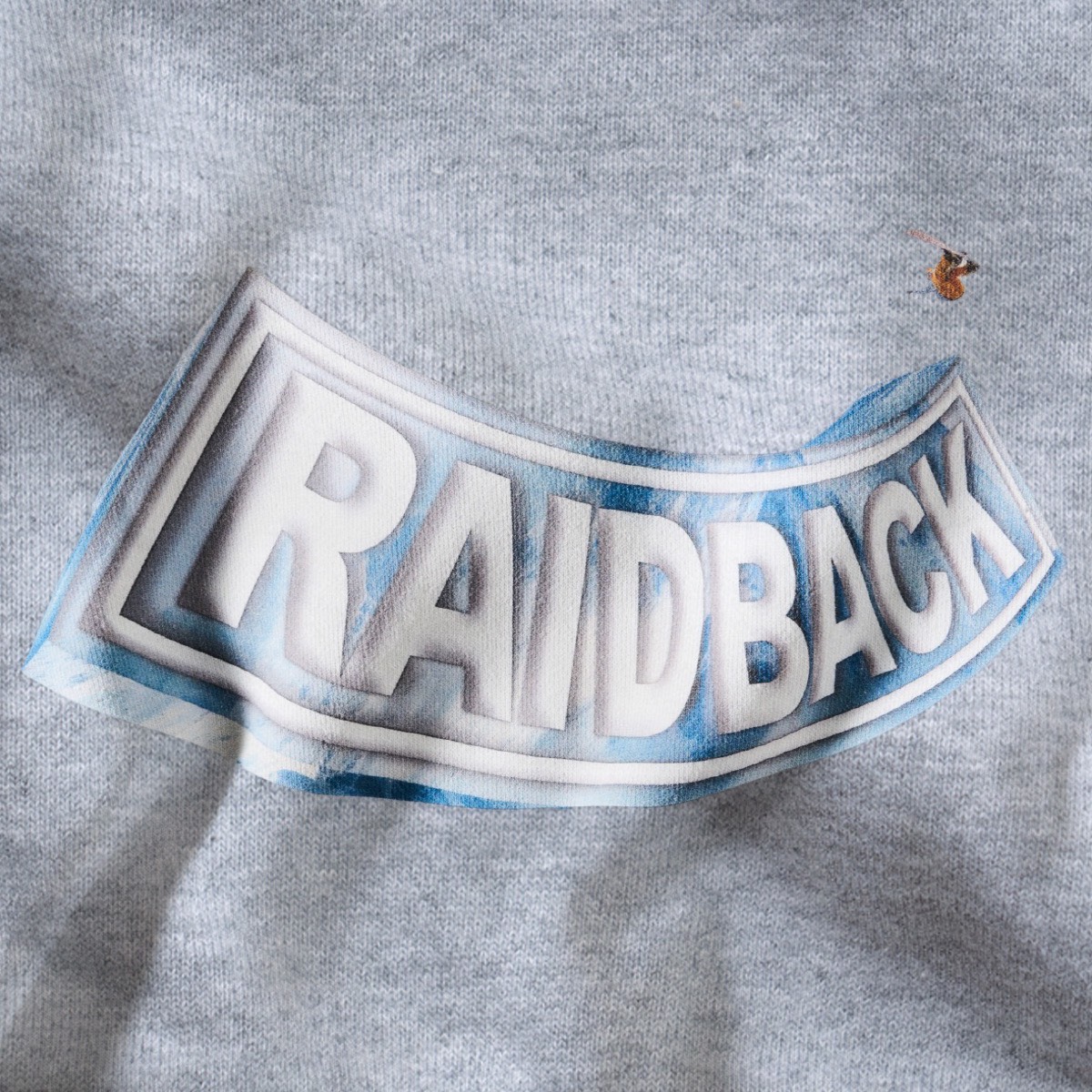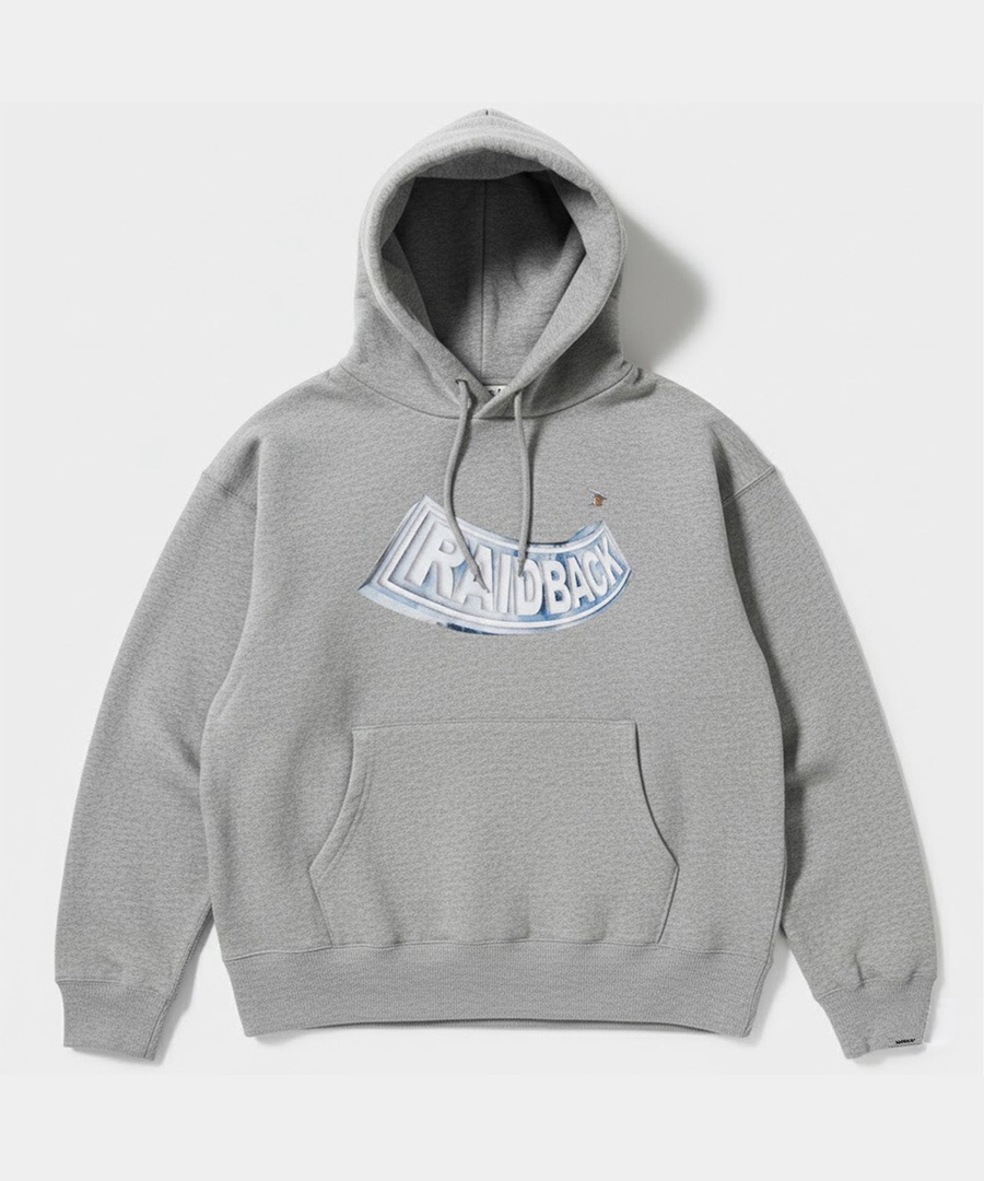 『RAIDBACKのキューブアーチロゴに、トリックをメイクするスケーターを落とし込んだグラフィックをアップデートしたプルオーバーフーディ』