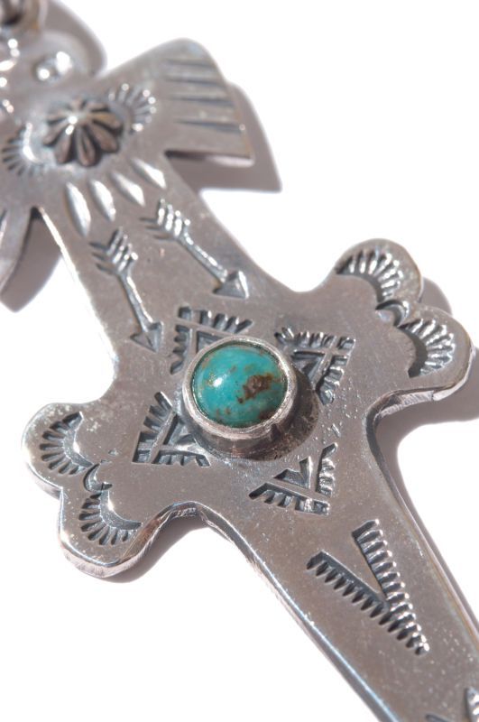 伝説上の巨鳥. 幸福を運ぶ鳥といわれている雷神鳥がモチーフで、強いスピリットとリーダーシップの象徴 "サンダーバード"のデザインにターコイズ石とコンビにさせたトラディッショナルなネックレストップになります。