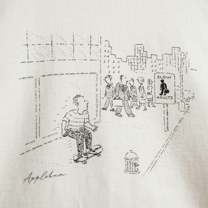 | APPLEBUM(アップルバム) 2024 SPRING / SUMMER COLLECTION 新作 【スケーターの日常を独自に表現】 ・スケートボードに乗る少年を素朴なタッチのイラストで表現したTシャツ。 ・柔らかなニュアンスのグラフィックの中に風刺画のようなメッセージを潜ませた1着です。 ・生地は、12ozというウルトラヘビーな天竺生地を使用。 ・身幅とアームホールを広げ、着丈はやや短めに仕上げたオリジナルシルエット。 |