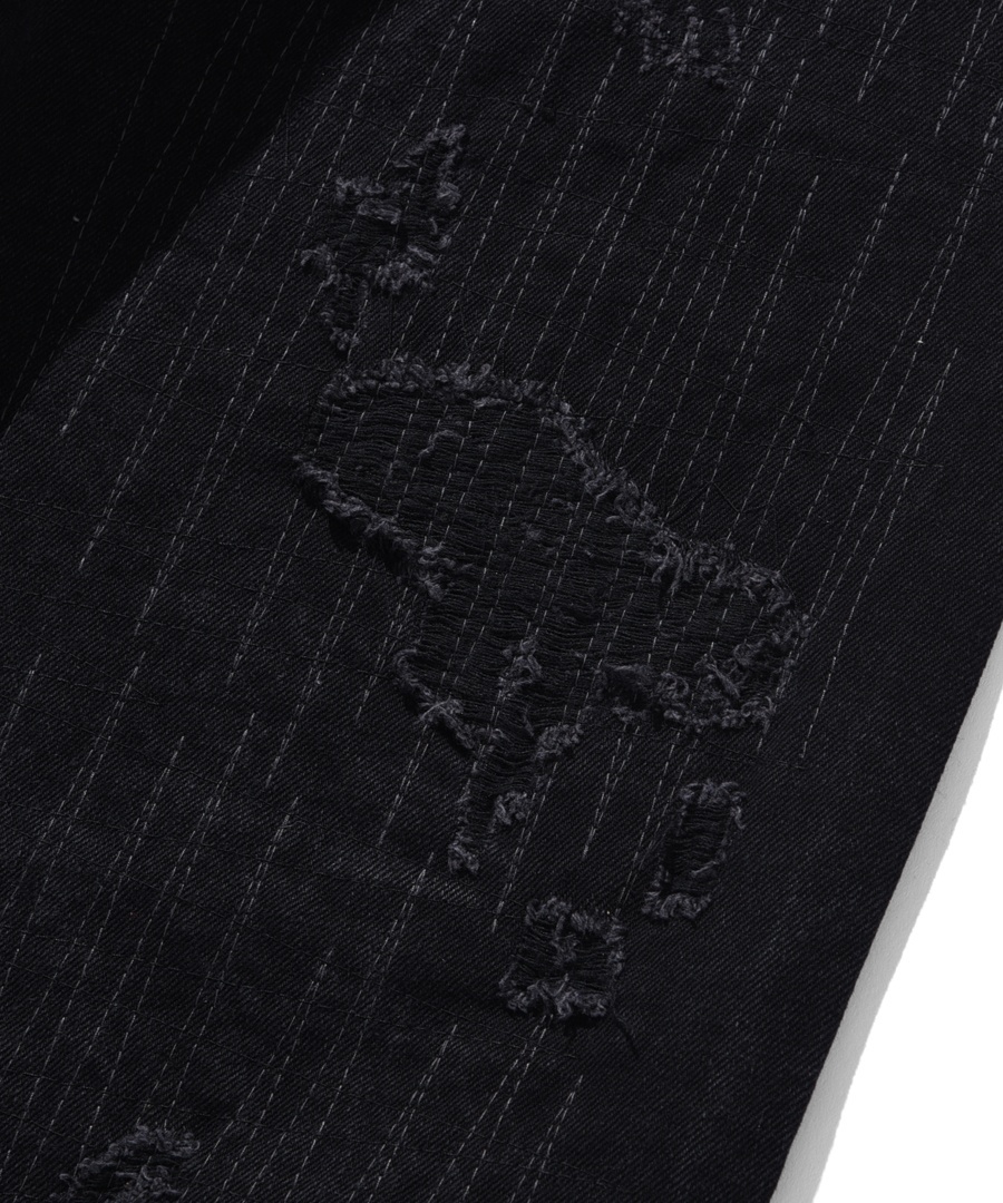 | ・EL REIGN(エルレイン) 2025 SPRING & SUMMER COLLECTION ▪️股下が長めのゆとりがるシルエット ▪️二重デニムの表面にのみダメージ加工し、空縫いを使用したデザイン。 ▪️ブラックカラーでありながら存在感のあるアイテム |
