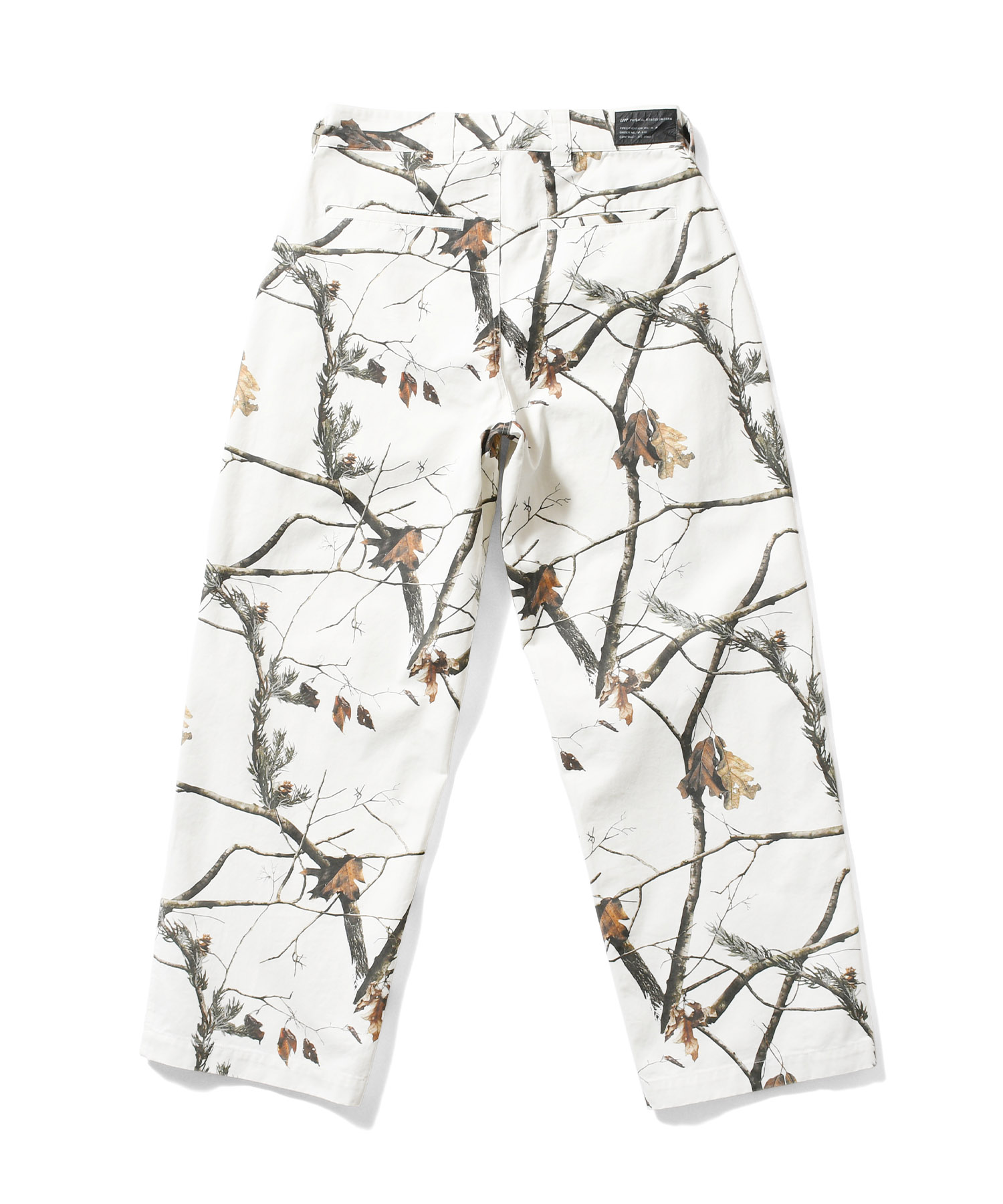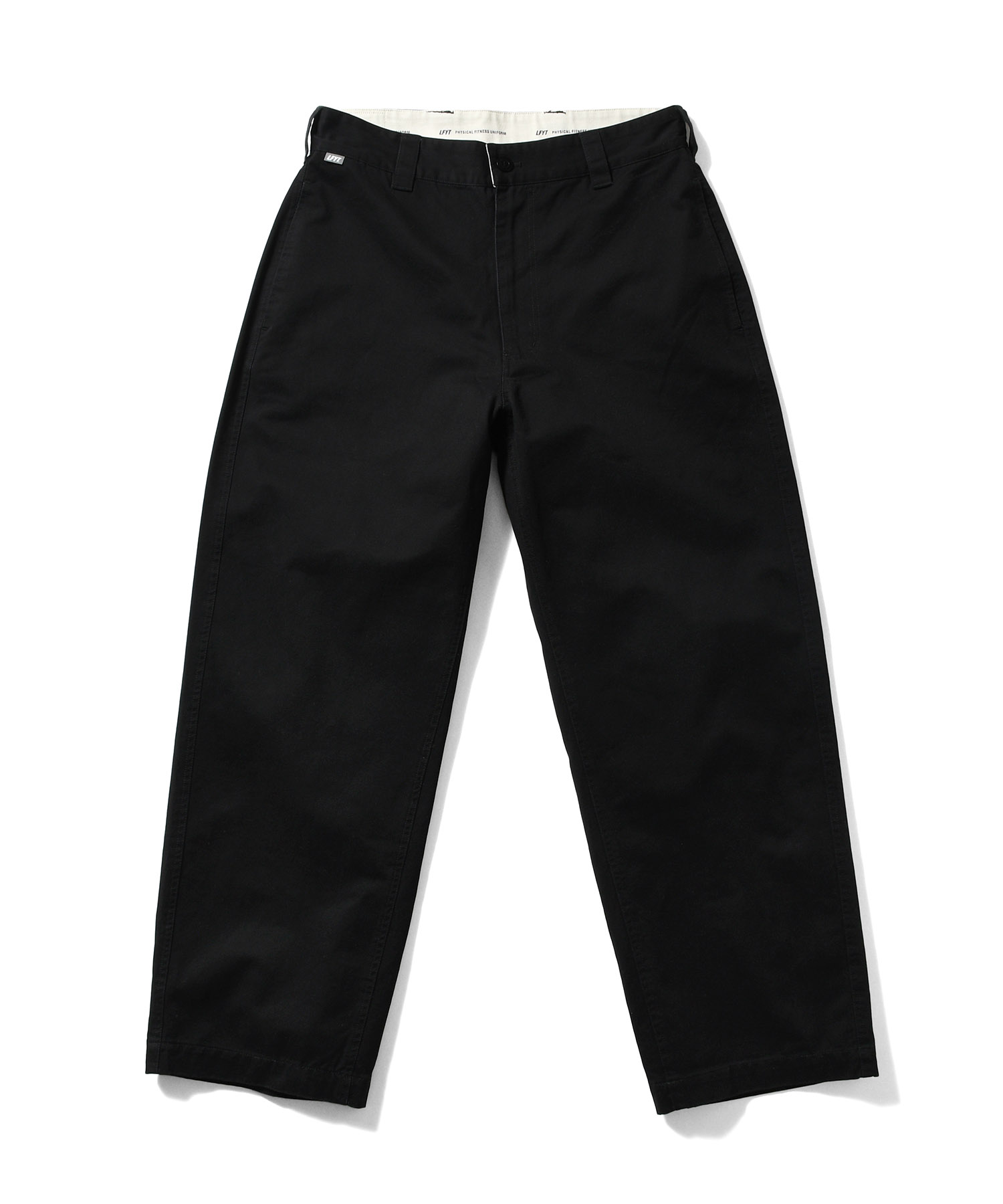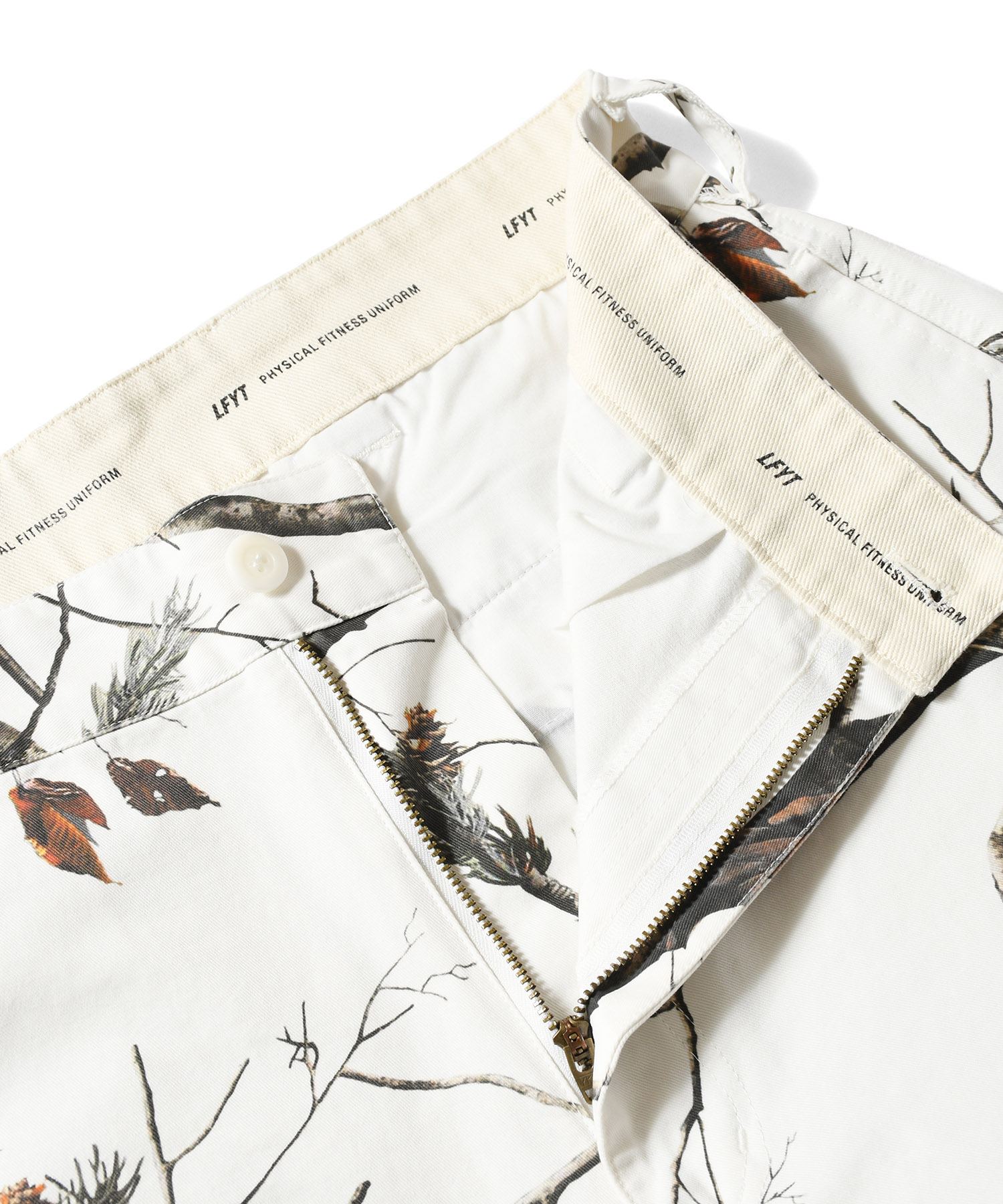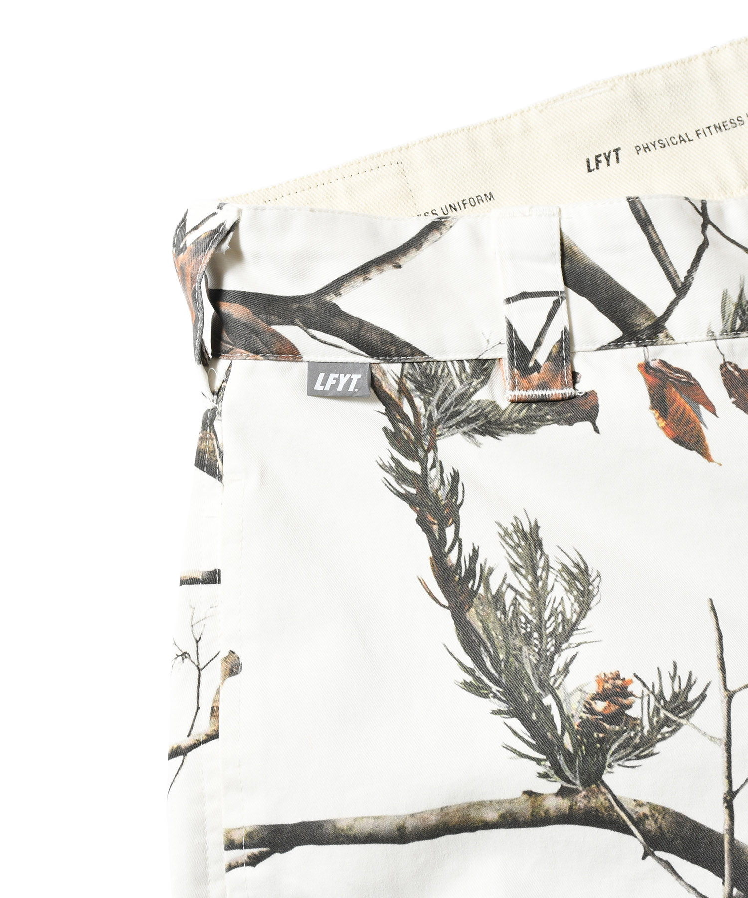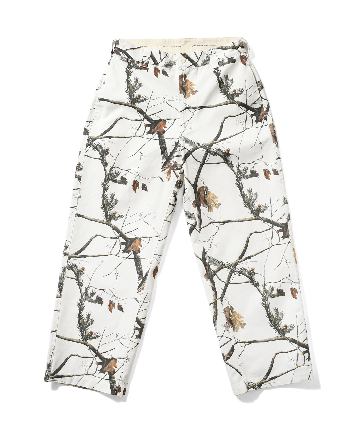 LFYT(ラファイエット) 2025 AUTUMN&WINTER COLLECTION ワイドストレートシルエットのコットンツイルトラウザーパンツ カラーは単色のブラックに加え、余白感のあるオリジナルリアルツリーカモと落ち着いた色味のオリジナルフレンチカモの全3色を展開。 内側の腰部分のスレキ生地には「LFYT PHYSICAL FITNESS UNIFORM」のロゴをプリント。 フロントのウエストバンドにはLFYTのリフレクターネーム、背面のウエストバンドにはミルスペック調デザインのタグを配置し、ミリタリー要素を感じさせるディテールに仕上げている。 |