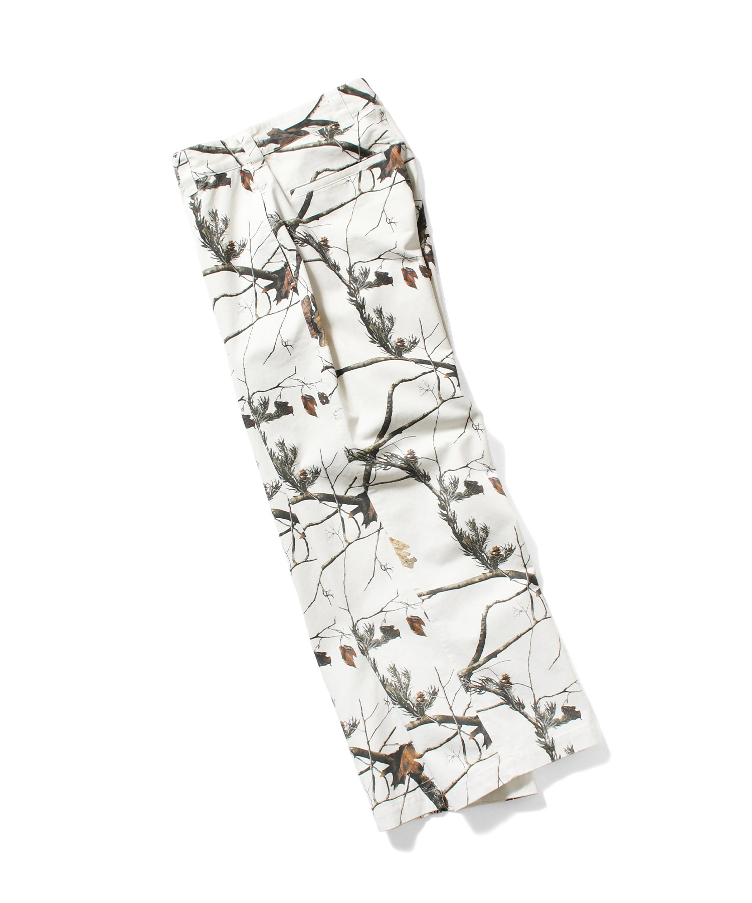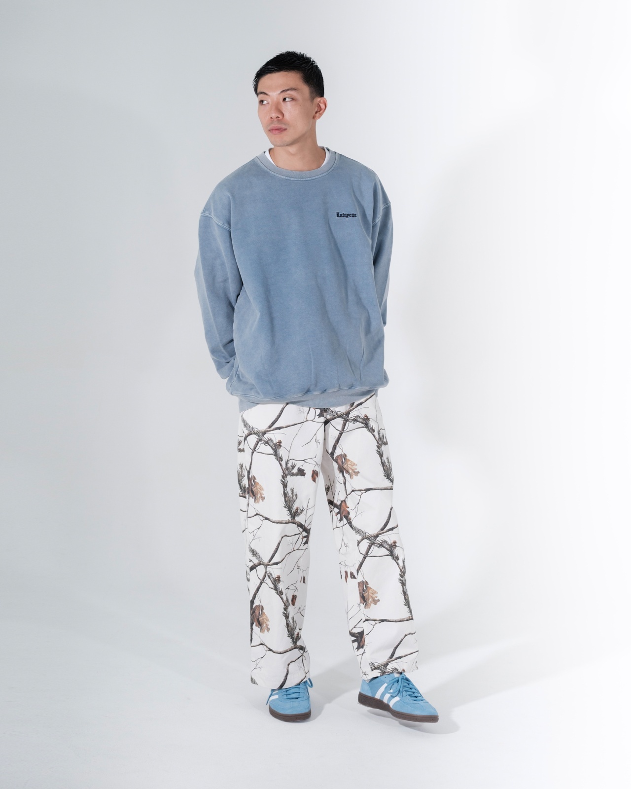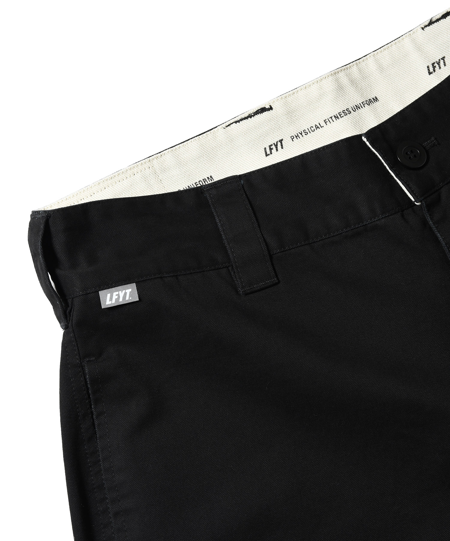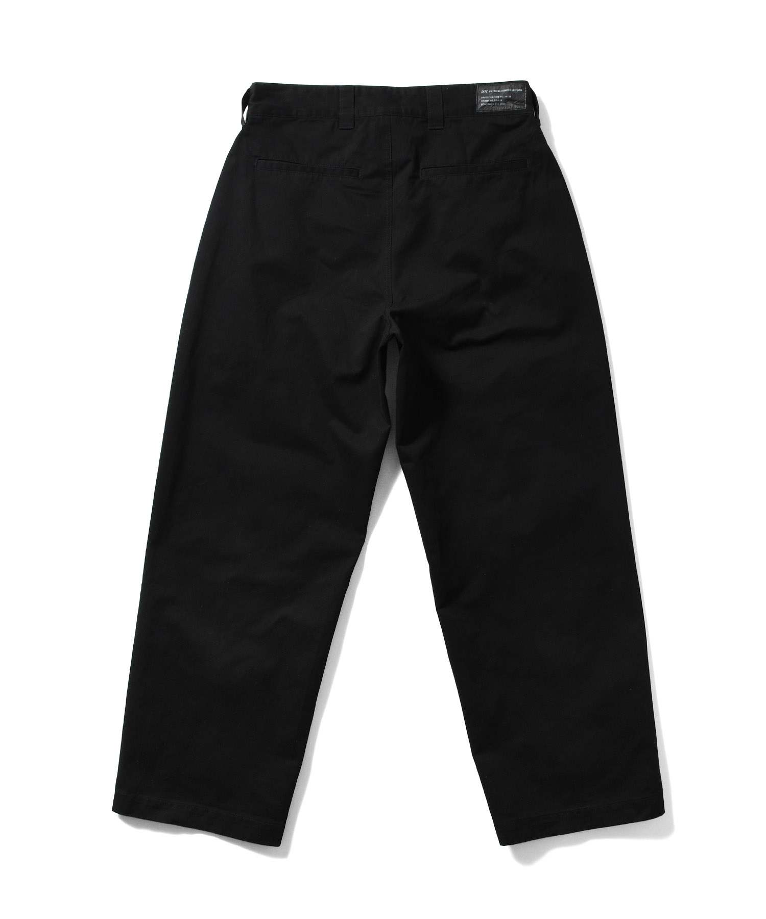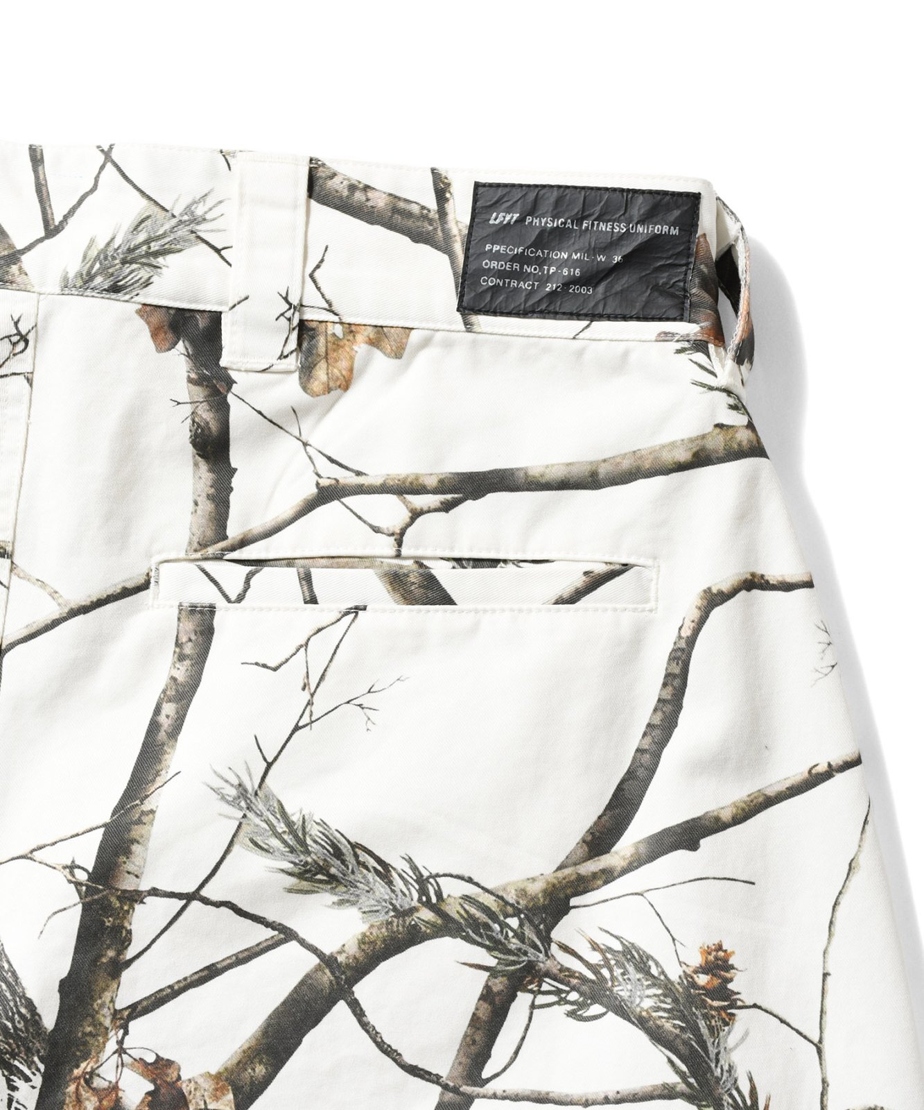 LFYT(ラファイエット) 2025 AUTUMN&WINTER COLLECTION ワイドストレートシルエットのコットンツイルトラウザーパンツ カラーは単色のブラックに加え、余白感のあるオリジナルリアルツリーカモと落ち着いた色味のオリジナルフレンチカモの全3色を展開。 内側の腰部分のスレキ生地には「LFYT PHYSICAL FITNESS UNIFORM」のロゴをプリント。 フロントのウエストバンドにはLFYTのリフレクターネーム、背面のウエストバンドにはミルスペック調デザインのタグを配置し、ミリタリー要素を感じさせるディテールに仕上げている。 |