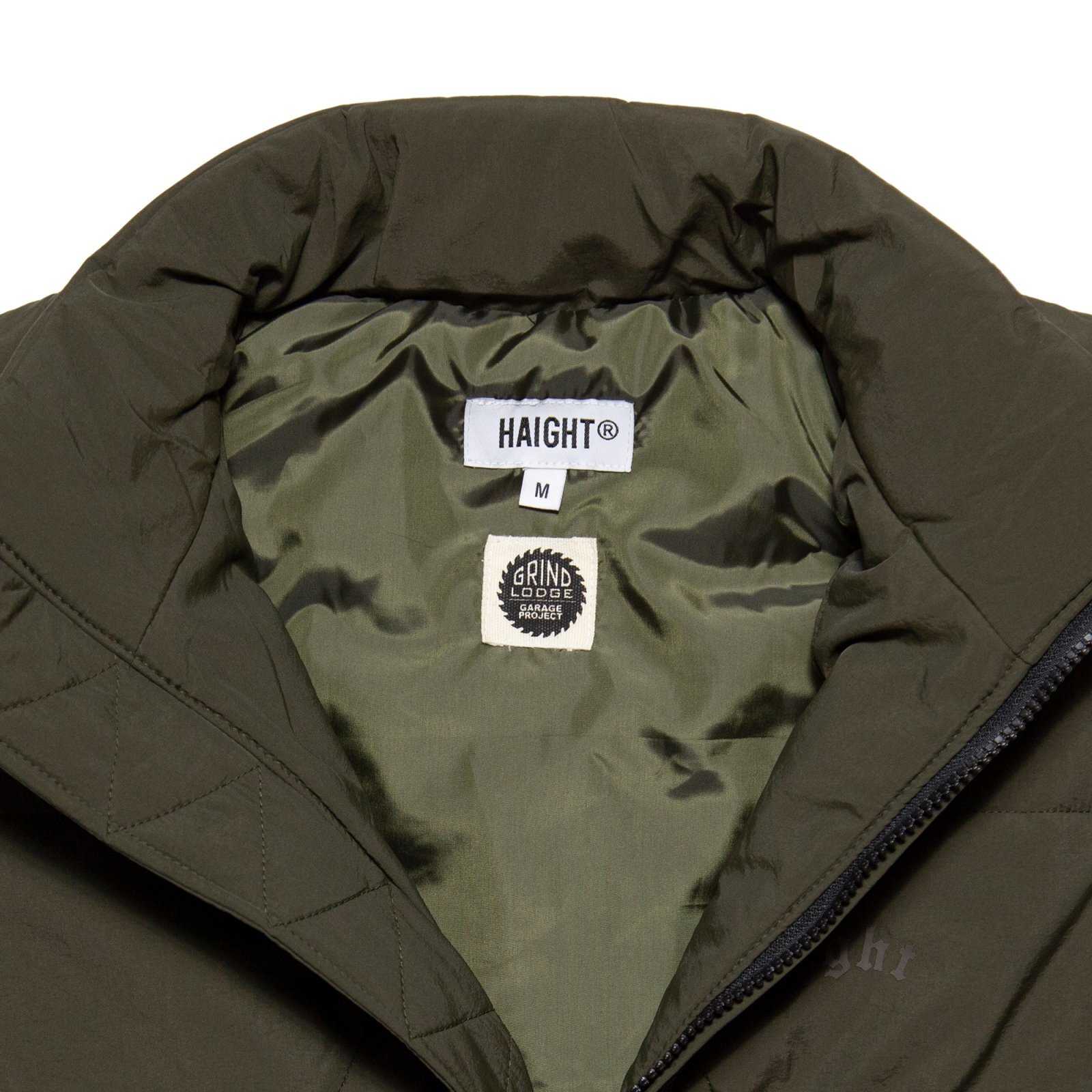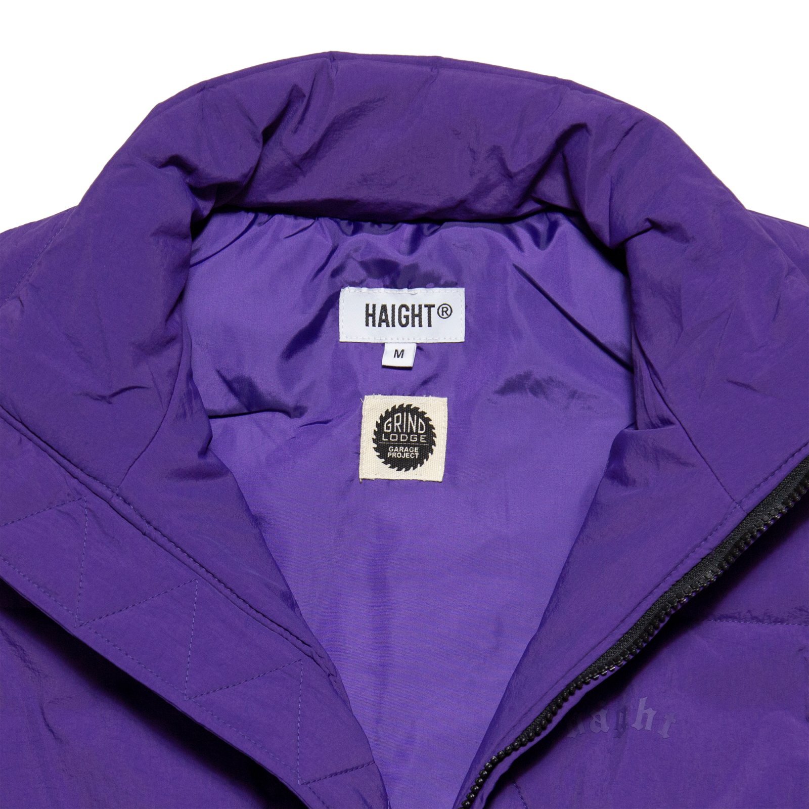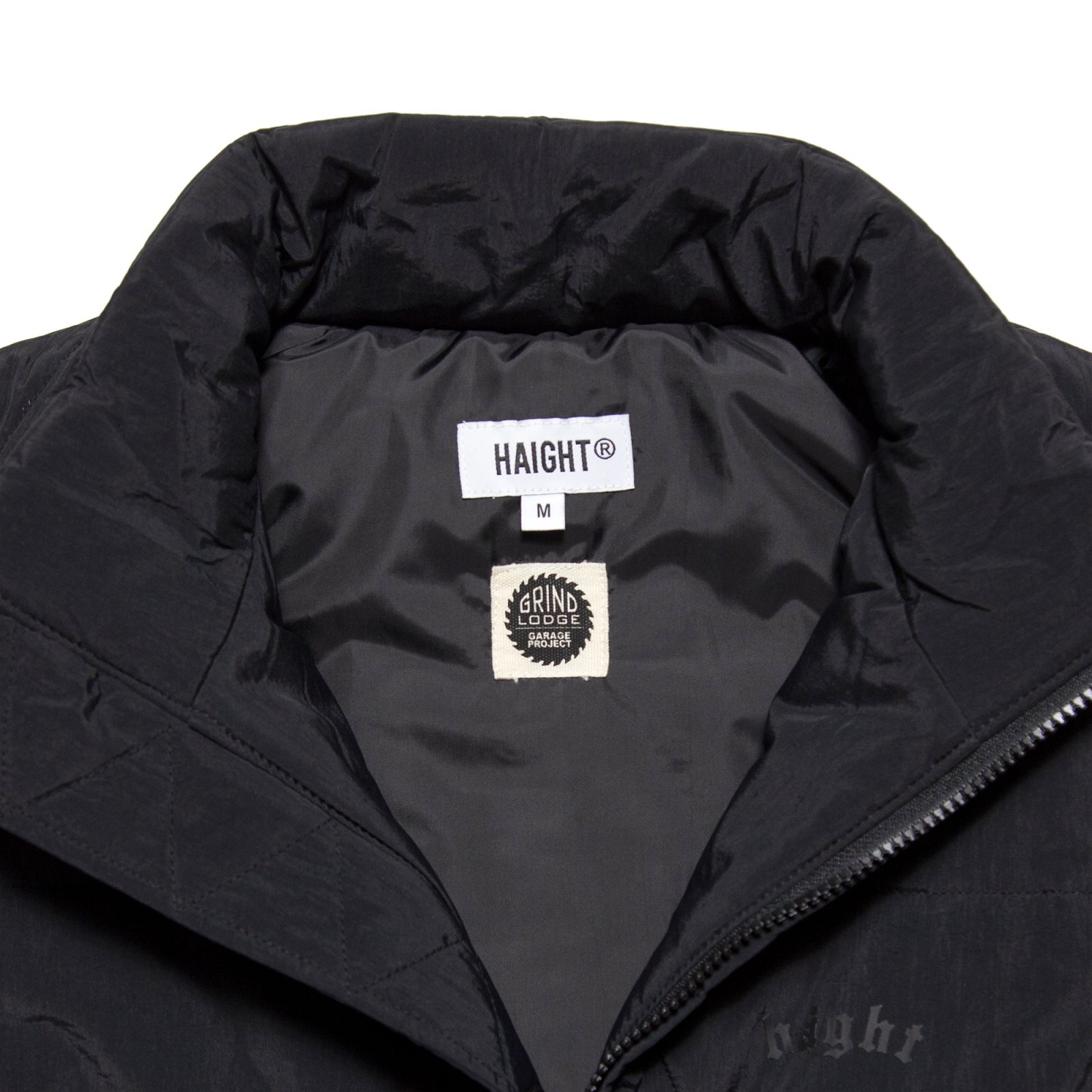 | HAIGHT(ヘイト) 2025 AUTUMN & WINTER COLLECTION 神奈川県川崎市のガレージを拠点に活動するクリエイティブ集団「GRINDLODGE」とのコラボプロダクト。 三角形のキルティングを全面に施した、ナイロン素材の中綿ベスト。 バックスタイルの中央の三角形に目の刺繍を施し、GRINDLODGEのアイコンを表現。 フロント左胸にはコラボロゴ刺繍、バック刺繍下のロゴは同色の立体プリントで仕上げることで、表情は抑えつつ存在感を残すバランス感に。随所に配されたオレンジのドローコードと引き手がアクセントとなり、全体の無機質な印象を程よく崩す。 表地には軽量なナイロン素材、裏地はタフタを使用し、中綿には高機能素材 "3M™ シンサレート™" を採用。 保温性と軽快な着用感を両立した一着に仕上がっています。 Linked with "GRINDLODGE " 「GRINDLODGE」 神奈川県川崎市のガレージを拠点に活動するクリエイティブ集団。 木材、鉄、コンクリートを用いたスケートボード用セクションの制作から始まり、現在ではアパレルやアートワークの制作・販売までを行う。 中でも、1枚ずつ手刷りで仕上げるシルクスクリーンプリントによるアパレル制作は、ブランドの中核を成す存在。 “生刷会”と称したイベントを各地で行い、持ち込まれたあらゆるモノにその場で刷るという、プリントカルチャーのライブパフォーマンスを展開。 量産では味わえない、その瞬間だけの表現は多くのヘッズを魅了する。 スケートボード、アート、音楽、アウトドア..複数のカルチャーを横断しながら、自分たちの手で“場”を作り続けるGRINDLODGE。 その独自の空気感は、国内外のフェスやイベントでも強い存在感を放っている。 |