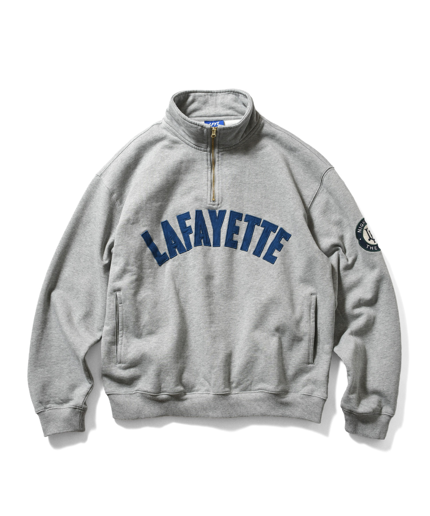 | LFYT(ラファイエット) 2025 AUTUMN&WINTER COLLECTION フロントにアップリケ仕様のLAFAYETTEアーチロゴを配したハーフジップスウェット 左肩には“NIGHT AND THE CITY”のサークルエンブレム刺繍を施し、ゴールドジップとフロント・肩のアップリケが上品なクラシックスポーツスタイルを演出。 サイドポケットと裏パイル仕様で、機能性と快適さを両立。 さらに全体にわずかな毛羽立ちを残すフロスト加工を施し、洗い込んだようなユーズド感とは異なる、上品で自然な風合いをプラス。 |