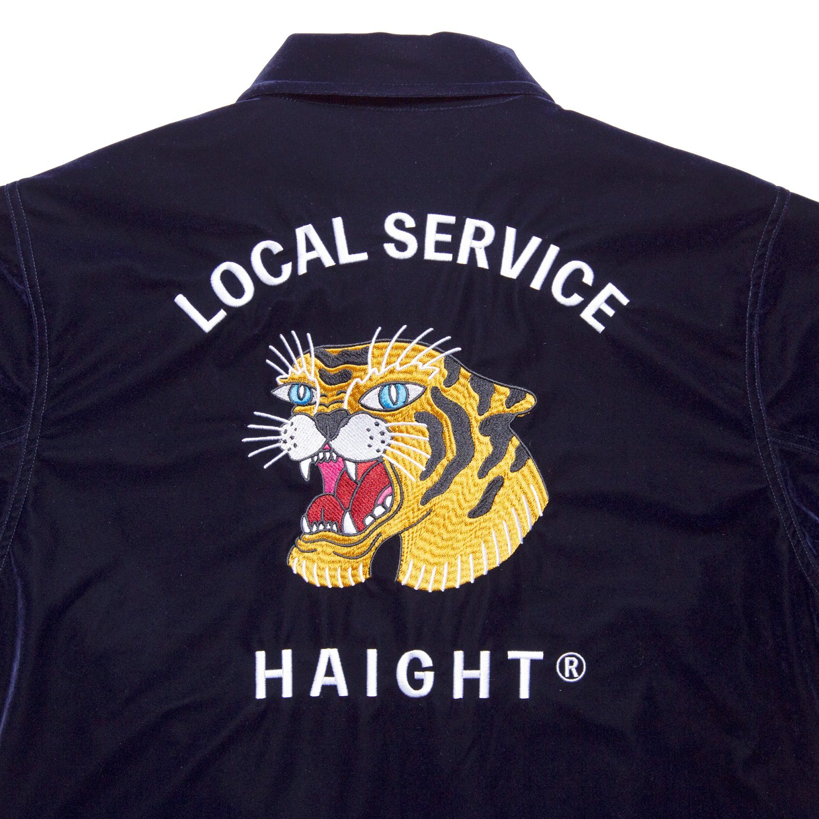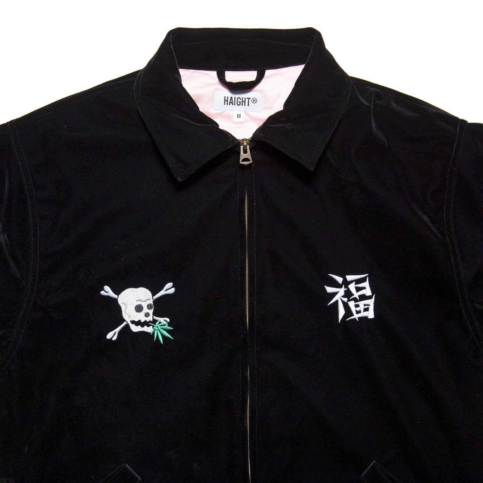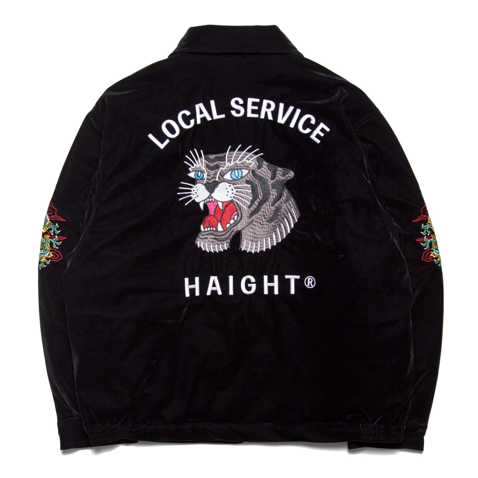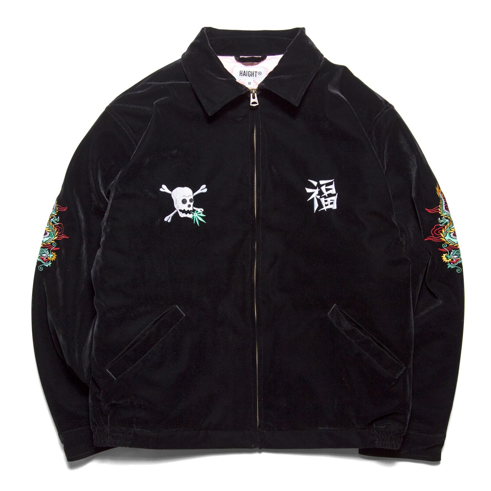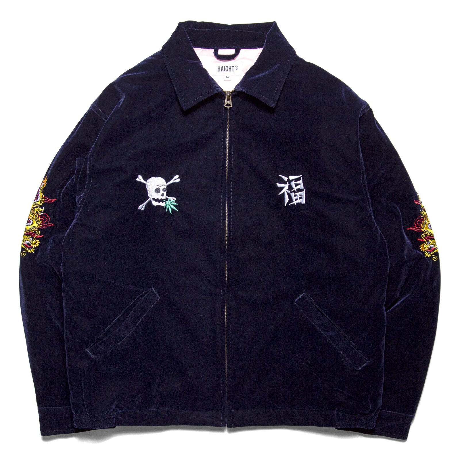 | HAIGHT(ヘイト) 2025 AUTUMN & WINTER COLLECTION ベロア素材を使用した、スーベニアジャケットをモチーフとした中綿入りブルゾン。 インパクトある背面の虎のアートワークをはじめ、両袖の龍、前身頃のドクロや福の一文字など、細部にわたって施された緻密な刺繍デザインは、仙台のTattoo Studio "SCRIBE TATTOO" による描き下ろし。 艶感のあるベロアと、淡いピンク色のキルティング裏地の組み合わせがクラシックかつ華やかな印象。 トラッドなデザイン性と防寒性を兼ね備えた一着。 |