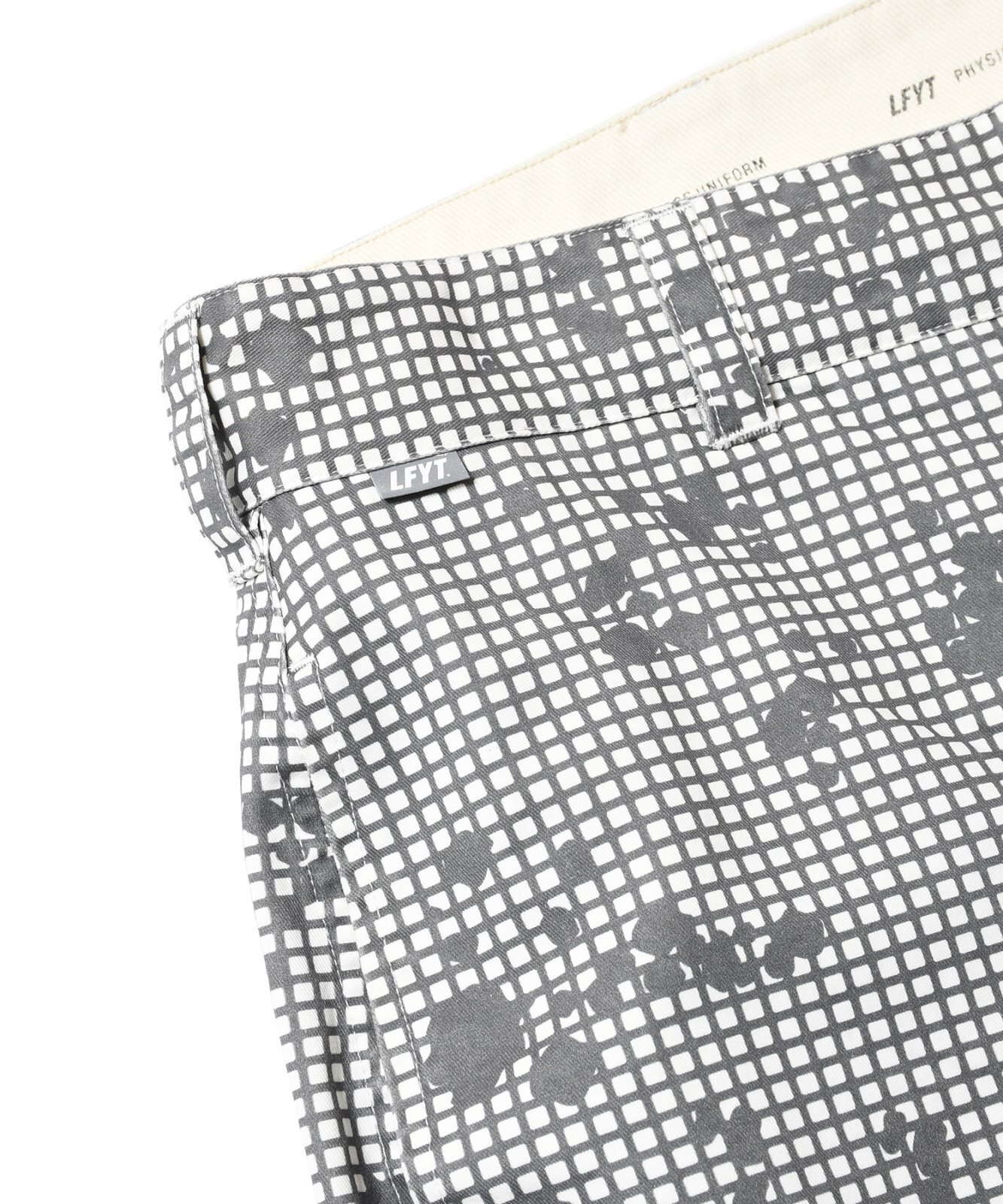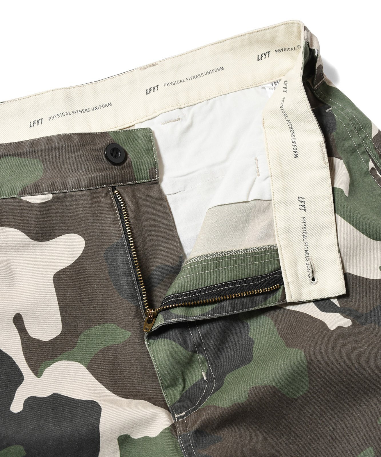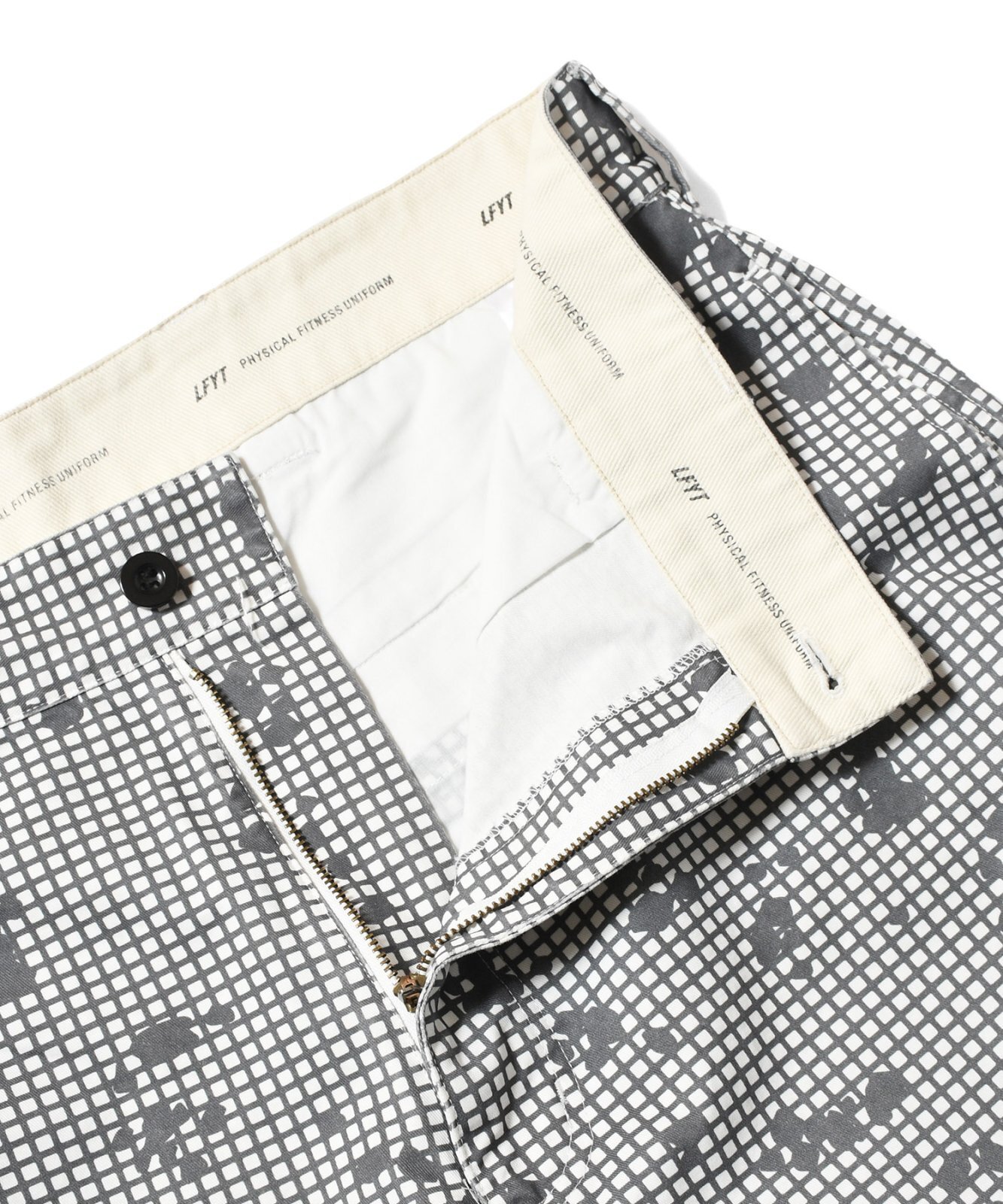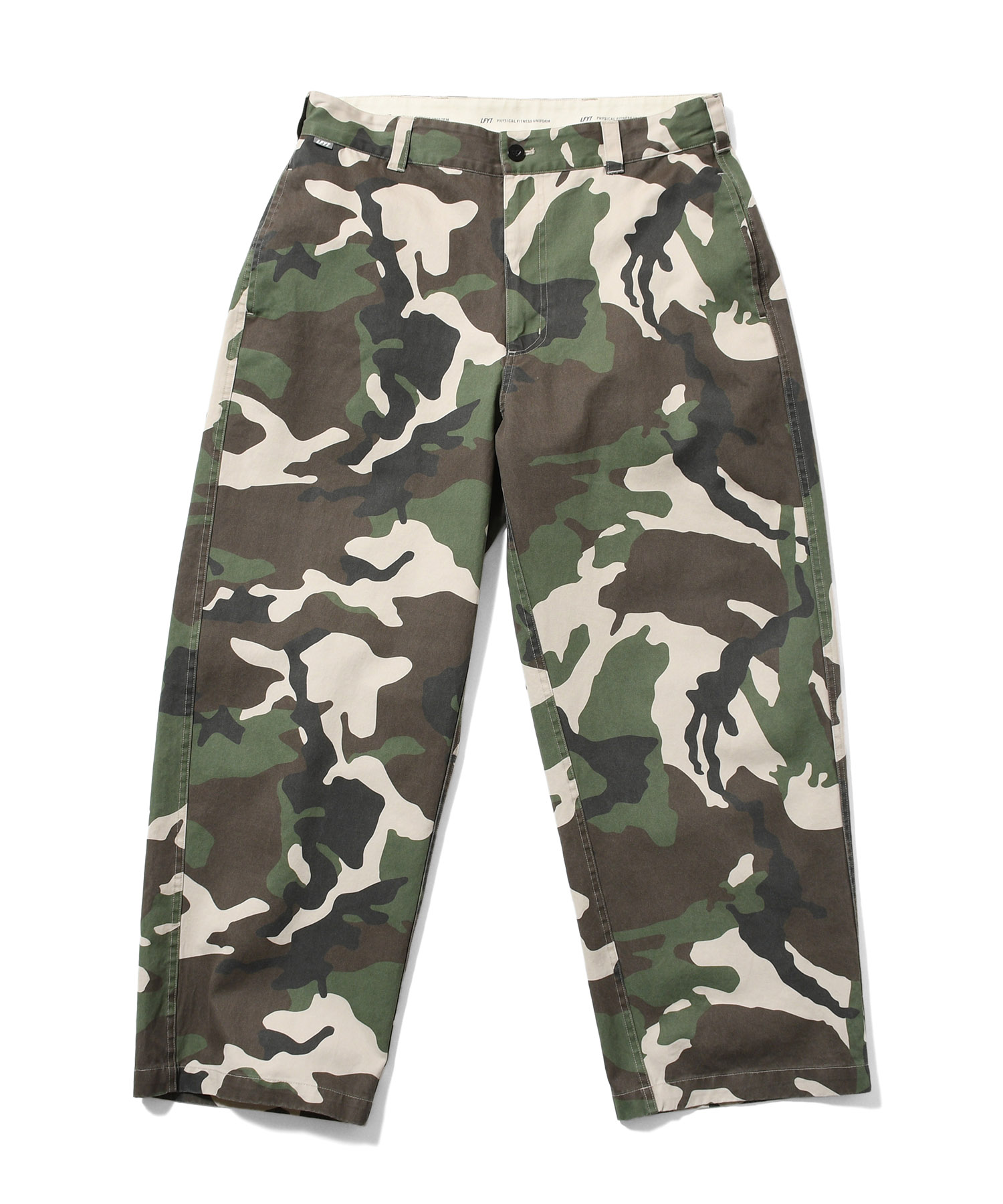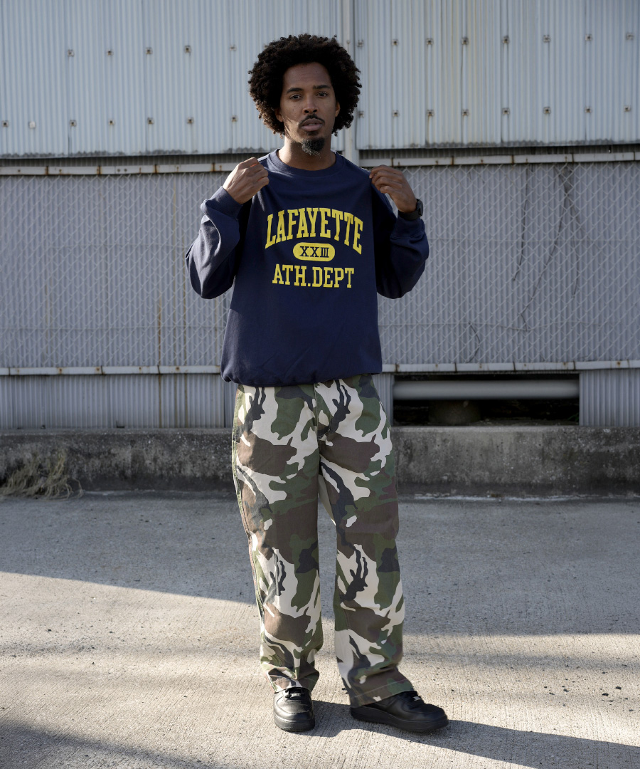 | LFYT(ラファイエット) 2026 SPRING&SUMMER COLLECTION ワイドストレートシルエットで仕上げたチノパンツ カラーは、ベーシックなネイビーに加え、柔らかな色味で構成されたウッドランドカモ、 シンプルな格子柄にインク染みのようなスポットを配した都会的な印象のナイトカモの全3色展開。 内側の腰部分のスレキには「LFYT PHYSICAL FITNESS UNIFORM」のロゴをプリント。 フロントのウエストバンドにはLFYTのリフレクターネーム、 バックポケットの上にはオレンジを基調としたミリタリータグを配置し、ディテールにもこだわりをプラス。 |